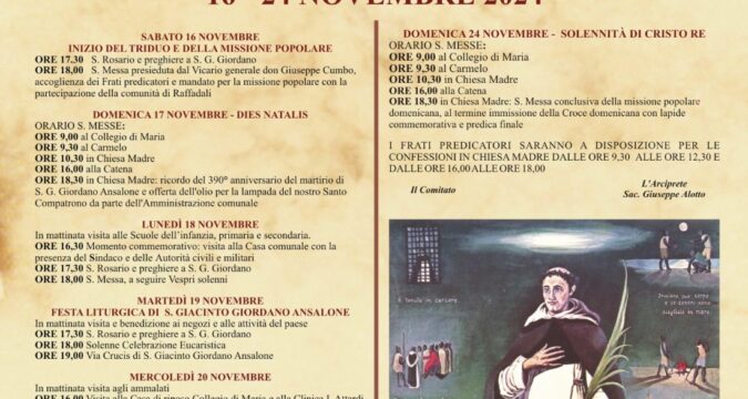 Sabato 16 novembre la comunità di Raffadali si unirà a quella di Santo Stefano Quisquina per accogliere i padri domenicani in Chiesa Madre, alla presenza del Vicario Generale don Giuseppe Cumbo.