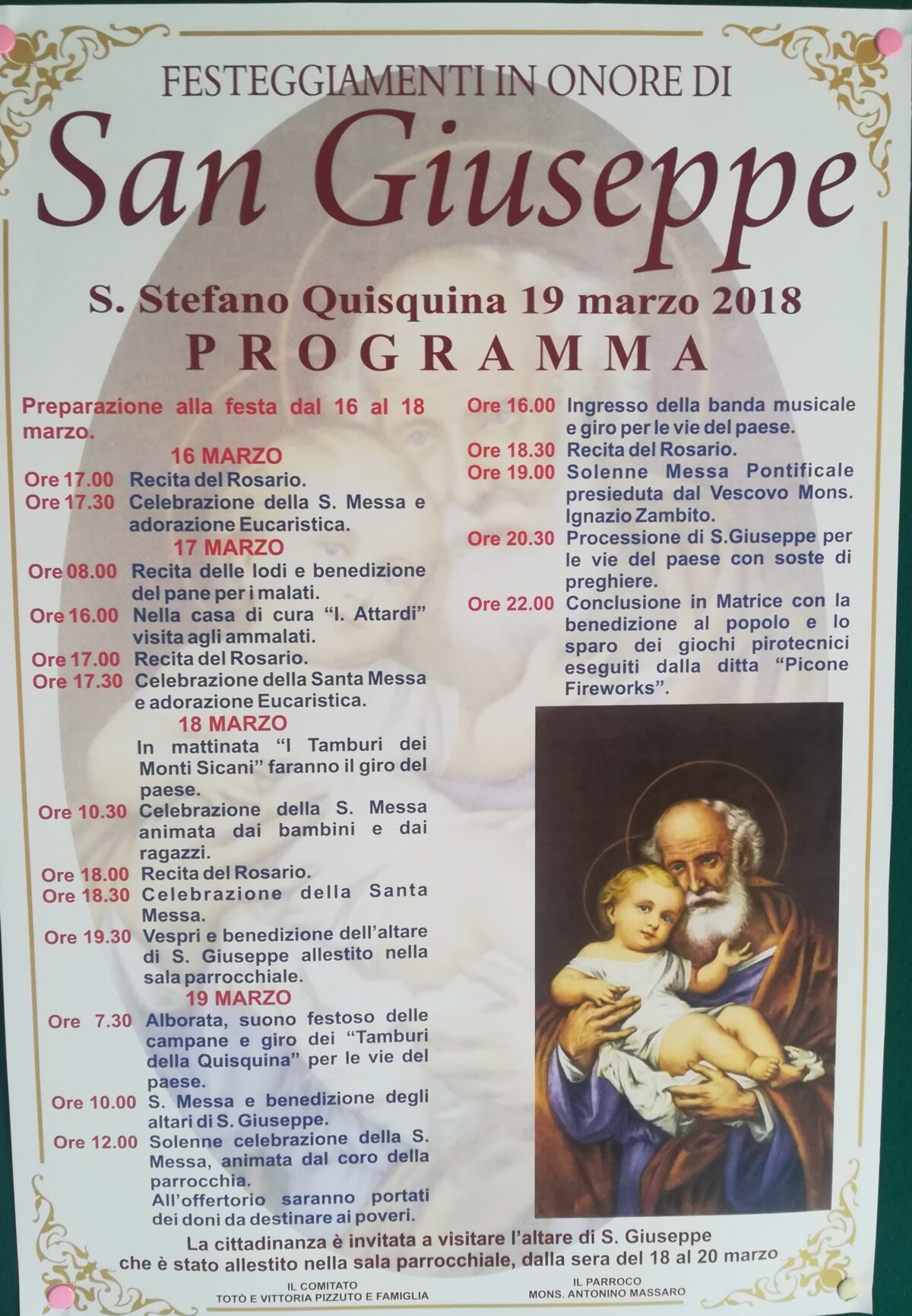 Di seguito il programma dei festeggiamenti 2018 organizzati dalla Famiglia Pizzuto che ha allestito l’altare presso la Sala Parrochiale della Chiesa Madre: