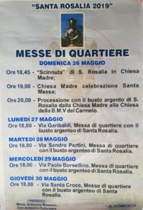 I festeggiamenti in onore di Santa Rosalia si avvicinano e  il comitato pro-festeggiamenti 2019 comunica le date e gli orari delle celebrazioni delle messe nei quartieri.