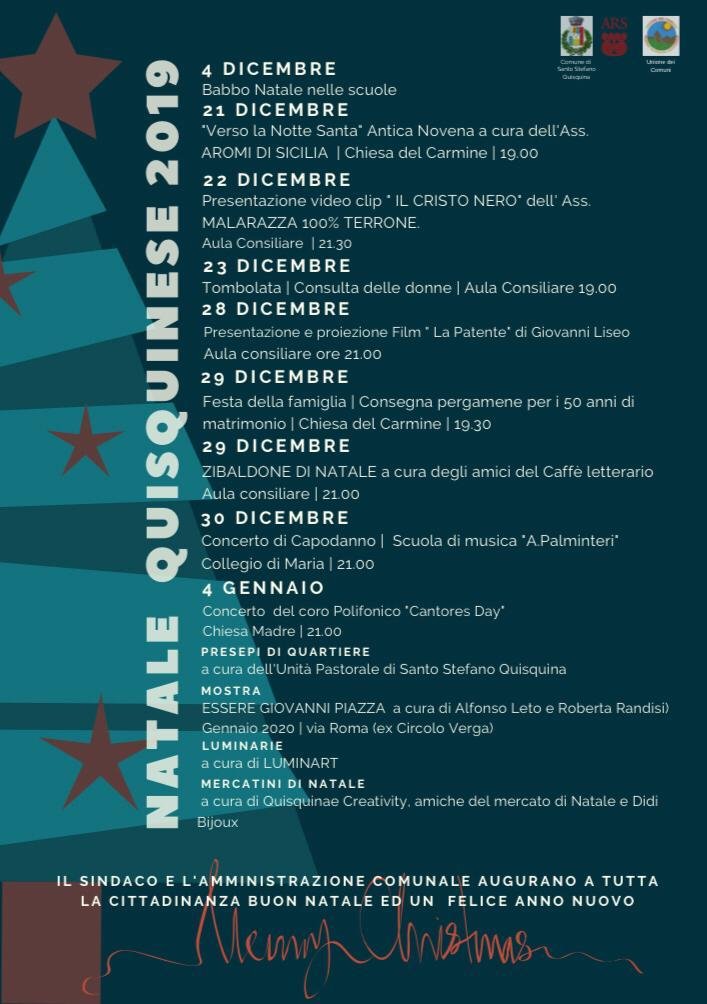 Natale Quisquinese 2019: il programmaAlessandro Mistretta9 Dicembre 2019in Primo Piano Reso noto il calendario delle attivitĂ natalizie del Comune di Santo Stefano Quisquina: tanti appuntamenti che iniziano il 21 dicembre, e che andranno avanti fino al 4 gennaio 2020. Ecco il programma: