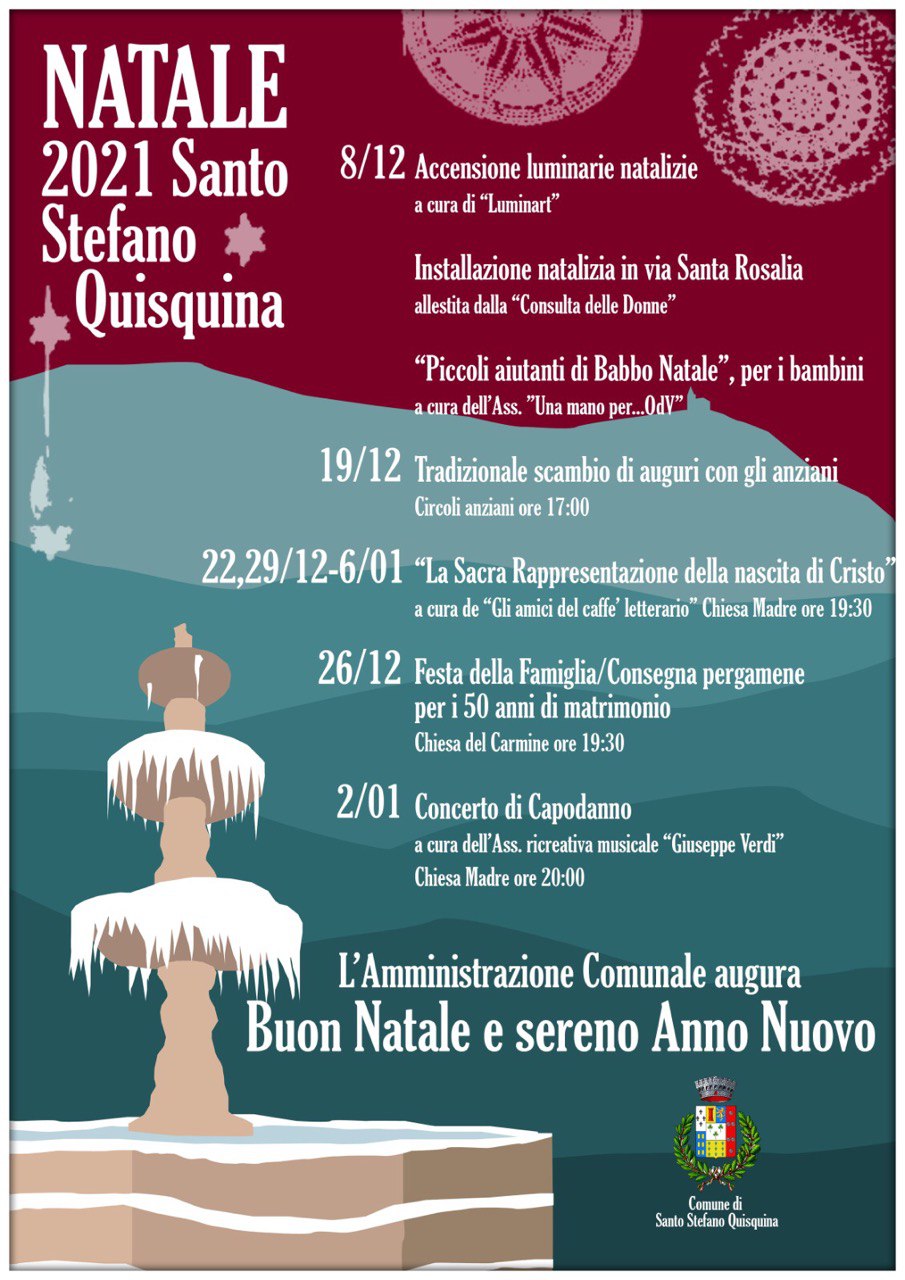 Natale Quisquinese 2021: il programmaAlessandro Mistretta19 Dicembre 2021Eventiin Primo Piano Reso noto il calendario delle attività natalizie 2021 del Comune di Santo Stefano Quisquina, ecco il programma: