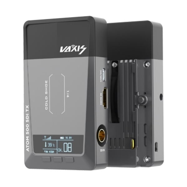 Dotato di connessioni 3G-SDI e HDMI, il kit trasmettitore e ricevitore video wireless ATOM 500 SDI di Vaxis consente la trasmissione di segnali video H.265 visivamente senza perdite al ricevitore Vaxis con una latenza inferiore a 80 ms.
