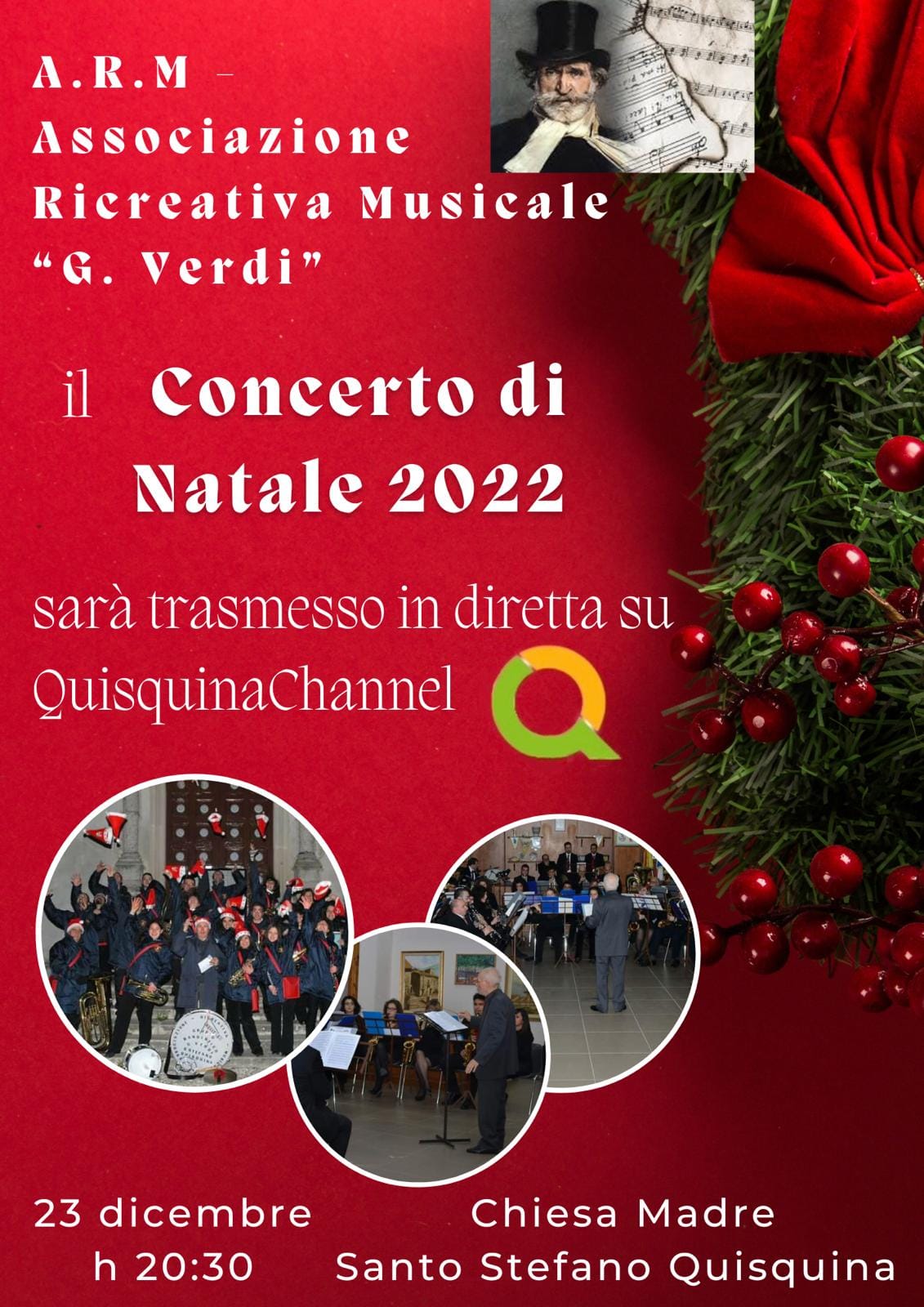 Dopo il successo della diretta estiva, Quisquinachannel trasmetterà il concerto di Natale dell’ Associazione Ricreativa Musicale “Giuseppe Verdi”. La diretta inizierà alle ore 20,30 del 23 dicembre 2022, e sarà trasmessa sui nostri canali You Tube, Facebook e sul sito www.quisquinachannel.it. Seguiteci!