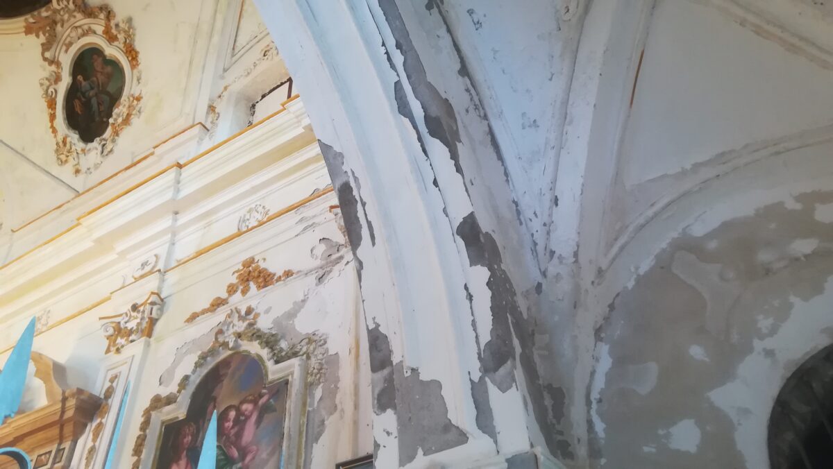 A causa dell’umidità si sta assistendo progressivamente al degrado del lato destro della Chiesa, con la decadenza dell’intonaco.