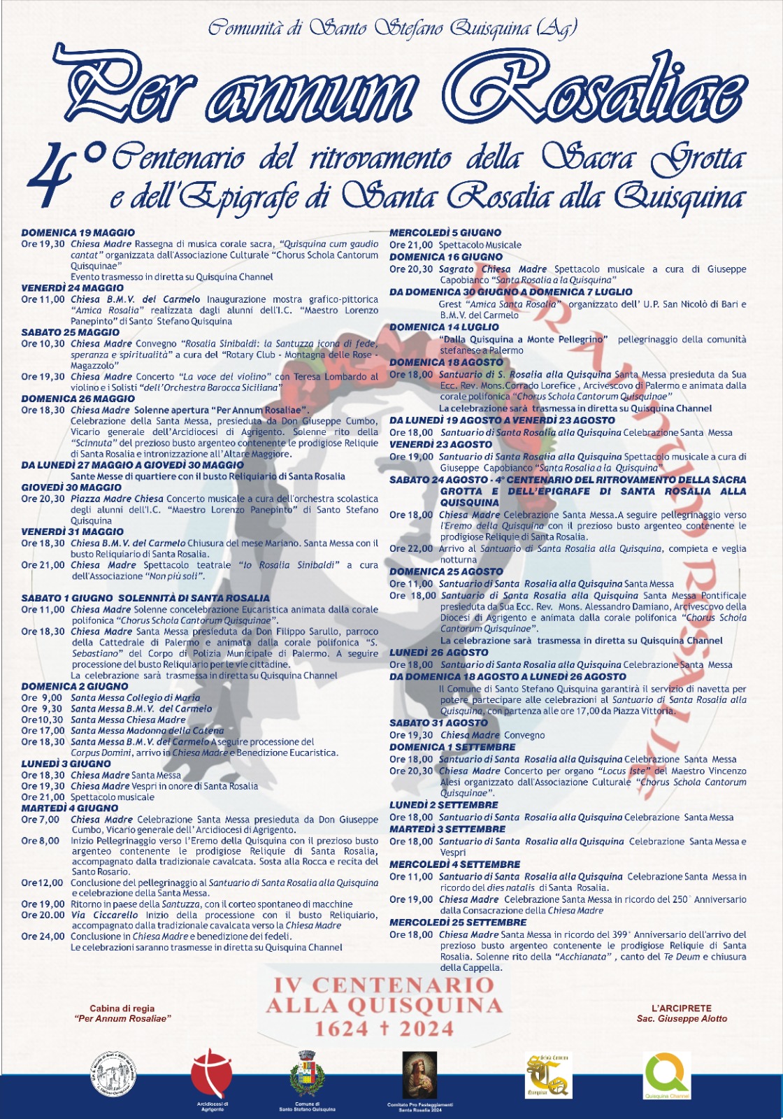 Le celebrazioni prenderanno il via domenica 19 maggio con una Rassegna di Musica Corale Sacra presso la Chiesa Madre, organizzata dall’Associazione Culturale “Chorus Schola Cantorum Quisquinae”. Sabato 25 Maggio si terrà il Convegno “Rosalia Sinibaldi: la Santuzza icona di fede, speranza e spiritualità a cura del “Rotary Club-Montagna delle Rose Magazzolo”.